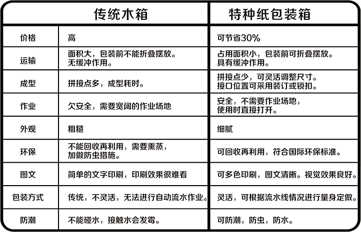 瓦楞紙箱在汽車配件包裝上越來(lái)越得到大量應(yīng)用,跟它本身所具備的特點(diǎn)是分不開的。下面卓爾雅用一張表格,幫您清晰認(rèn)識(shí)紙箱包裝相比傳統(tǒng)木箱包裝的優(yōu)勢(shì)在哪里?